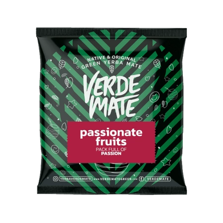 - Verde Mate Green Passionate Fruits s mimořádně bohatou kombinací chutí, které neodoláte! Lákavá kombinace různých druhů ovoce: papáji, černého rybízu, bobulí goji a mučenky a okvětních lístků: chrpy a ibišku.