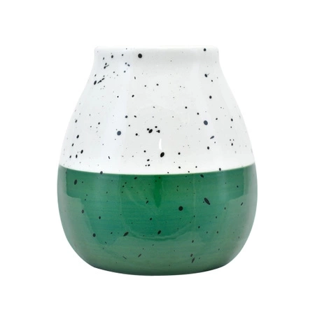 Ceramic calabash “Papagayo” – a convenient, solidly made yerba mate gourd with a capacity of approximately 300-350ml. The shape of the gourd is inspired by traditional South American calabashes. Glazed inside and out. Covered in a light glaze and decorated with black, irregularly speckled patterns. It features a stylish cut-off at the bottom in green colour. The designer yerba mate drinking gourd will perfectly complement the equipment of every mateist!