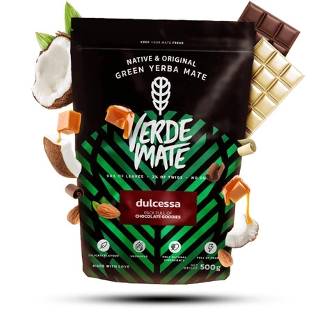 - Verde Mate Green Dulcessa est un maté créé pour tous les amateurs de chocolat. La base de la composition est le maté tostada, qui a été combiné avec de gros flocons de trois types de chocolat, des copeaux de noix de coco et des flocons d’amandes.