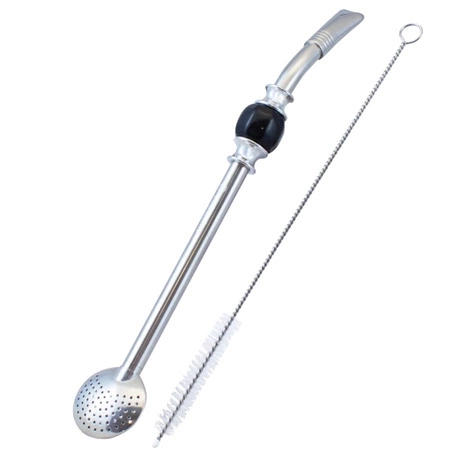 Bombilla für brasilianischen Mate Tee (chimarrao). Am Mundstück befindet sich ein farbiger Kühlring. Sie wird mit einem gut filternden Sieb geendet, das perfekt für Tee in Pulverform ist. Sie hat Teile, die verdreht sind. Edelstahl sorgt für Haltbarkeit und Beständigkeit gegen mechanische Beschädigungen und hohe Temperaturen. Einfaches Design verleiht Eleganz und Funktionalität. Ein Vorteil ist beigefügter Wischer dank dieses man Bombilla einfach reinigt.