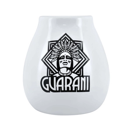 Praktisches Mate Tee Gefäß mit einer Kapazität von ca. 350 ml . Hergestellt aus hochwertiger Keramik.Es hat ein klassisches Design, das von traditionellen südamerikanischen Kürbissen inspiriert ist. Dekoriert mit dem Logo der Marke Guarani. Innen und außen glasiert. Leicht zu reinigen und widerstandsfähig gegen verschiedene Arten von mechanischen Beschädigungen.